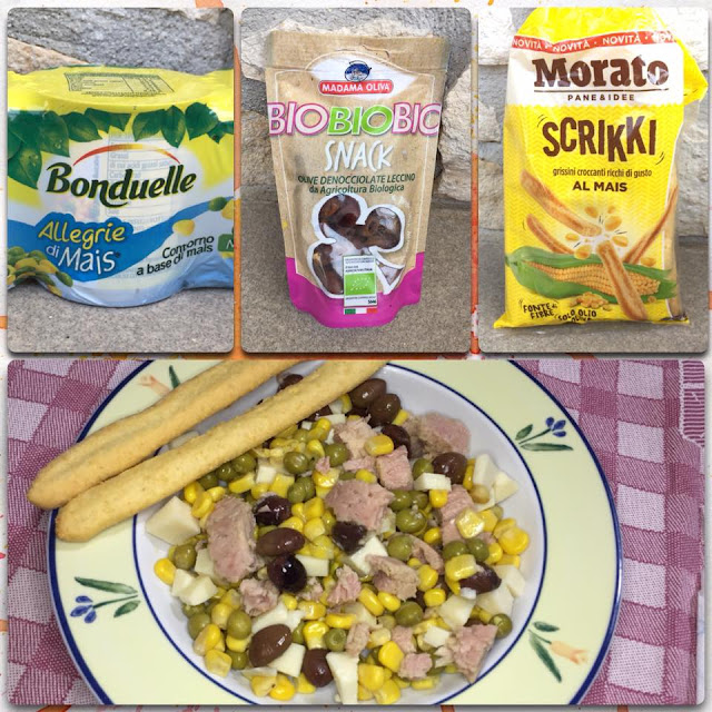 Proprio l'altra sera ho preparato una cena veloce, fresca e leggera. Allegrie di Mais di Bonduelle con mais e piselli, olive nere linea Bio Snack di Madama Oliva, tonno e cubetti di formaggio. Ad accompagnare questo secondo i grissini croccanti Scrikki di Morato Pane, ricchi di gusto, con farina e granella di mais.